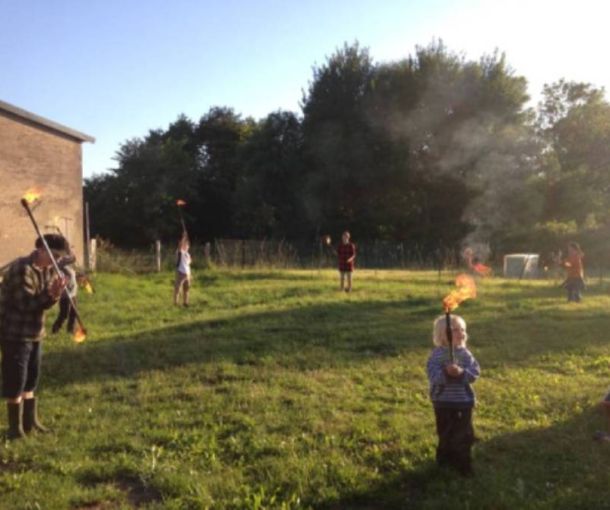 Mit Lagerfeuer, Musik und Feuerspiel. Eine Vorferienfreude! Übernachten in Zelten und im Allerhandhaus. Für Menschen jeden Alters.