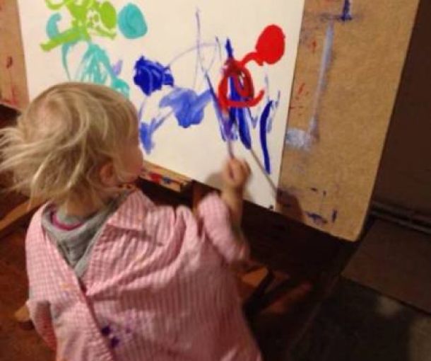 Klein und Groß wählen die Pinsel je nach Farbe aus und lernen das neue Malgefühl an den Malwänden kennen.