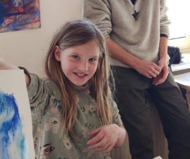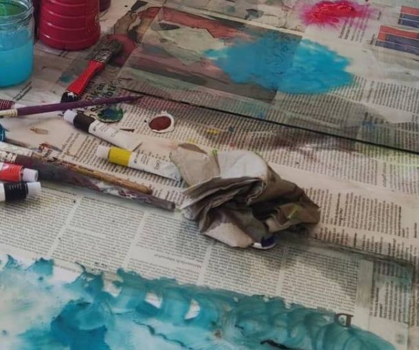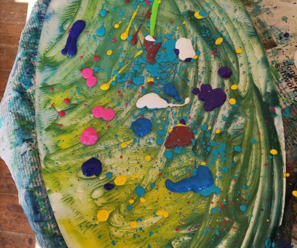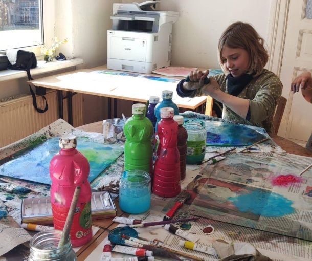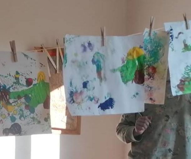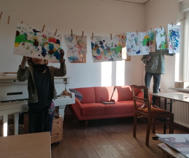 Die getrockneten Werke konnten mit Stiften oder dem Pinsel weiterbearbeitet werden und Details bekommen. So konnten aus den entstandenen Farbwolken Dinge, Tiere und Wesen entstehen.