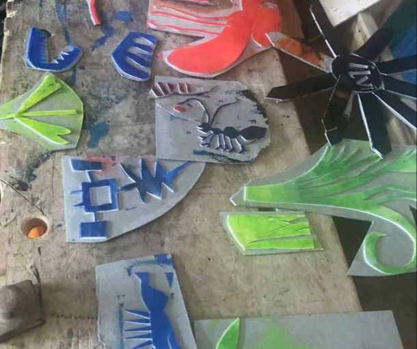 Auch in diesem Jahr sollte es eine Ausstellung von künstlerischen Arbeiten an den Straßenlaternen in Qualitz geben. Wir hatten dieser Straßengalerie das Thema „Insekten“ gegeben und freuten uns, dass Janne Margo König, Holzbildhauerin und Spielplatzgestalterin (Hü – und Hott Spielskulpturen), den Workshop leitete. Diesmal wurde ein wenig geschnitzt (Holz- und Linolschnitt), gesägt und es wurden Dinge ausgeschnitten, um riesige Stempel zu bauen, … aber vor allem wurde gedruckt – und dabei haben wir erfahren, wie das geht.