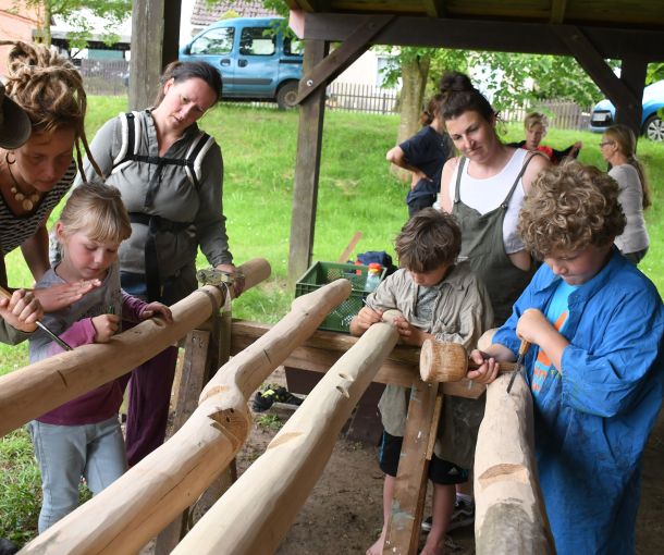 Am Tag vor dem Aufbau schmückten sie gemeinsam mit Kindern die Pfähle mit Schitzereien und Bemalung.