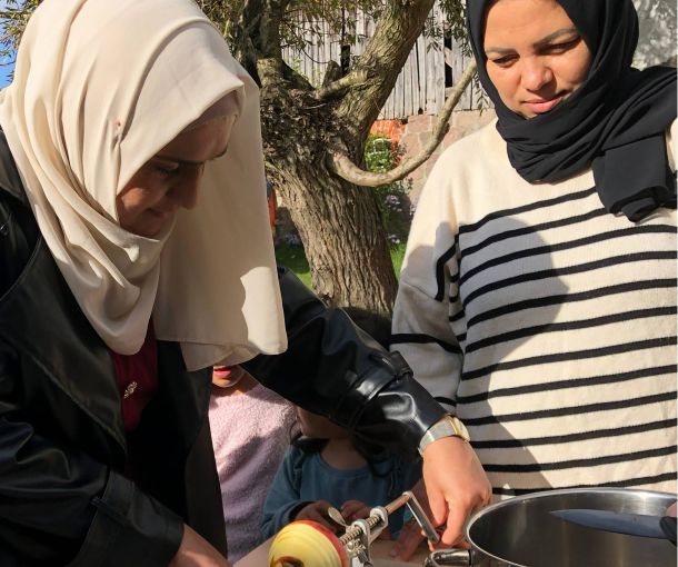 Nach dem Kochen drehten fleißige Helferinnen die flotte Lotte und füllten das Apfelmus in die Gläser.